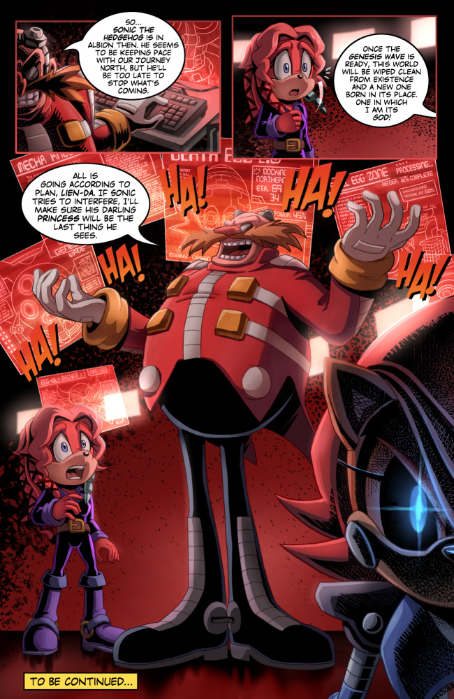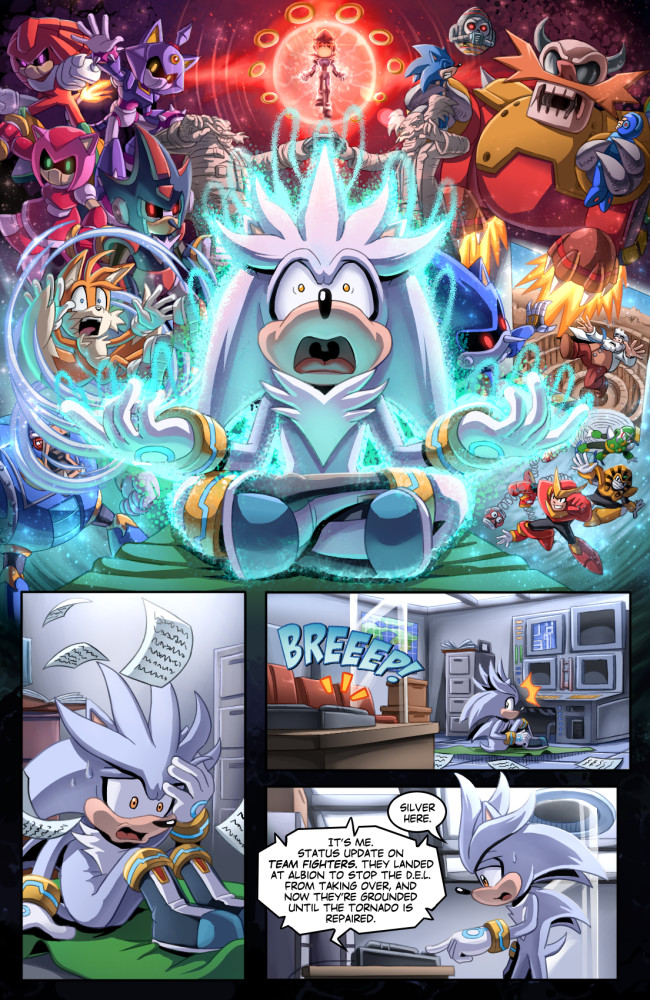 The fan comic does make a nod to the Worlds Collide Sonic & Mega Man 2013 crossover that lead to the reboot, this hints the crossover will happen at some point in the future but not right away. How does the nod happen? Silver is meditating and communicating with Mammoth Mogul's future self through the veil of time and gets a vision of events to come such as the aforementioned crossover. Even Eggman has plans to unleash the Genesis Wave again. Heck, at the end of issue one of this series, Eggman talks with Lein-Da (the hot and shapely echidna grandmaster chick) and cackles evilly as he says, "So Sonic is making his way north here. It won't matter, once I unleash the Genesis Wave, this world will be wiped from existence and a new one will be born in its place which I will be its ruler. The last thing Sonic will ever see will be his princess. HA HA HA HA HA HA HA HA!"