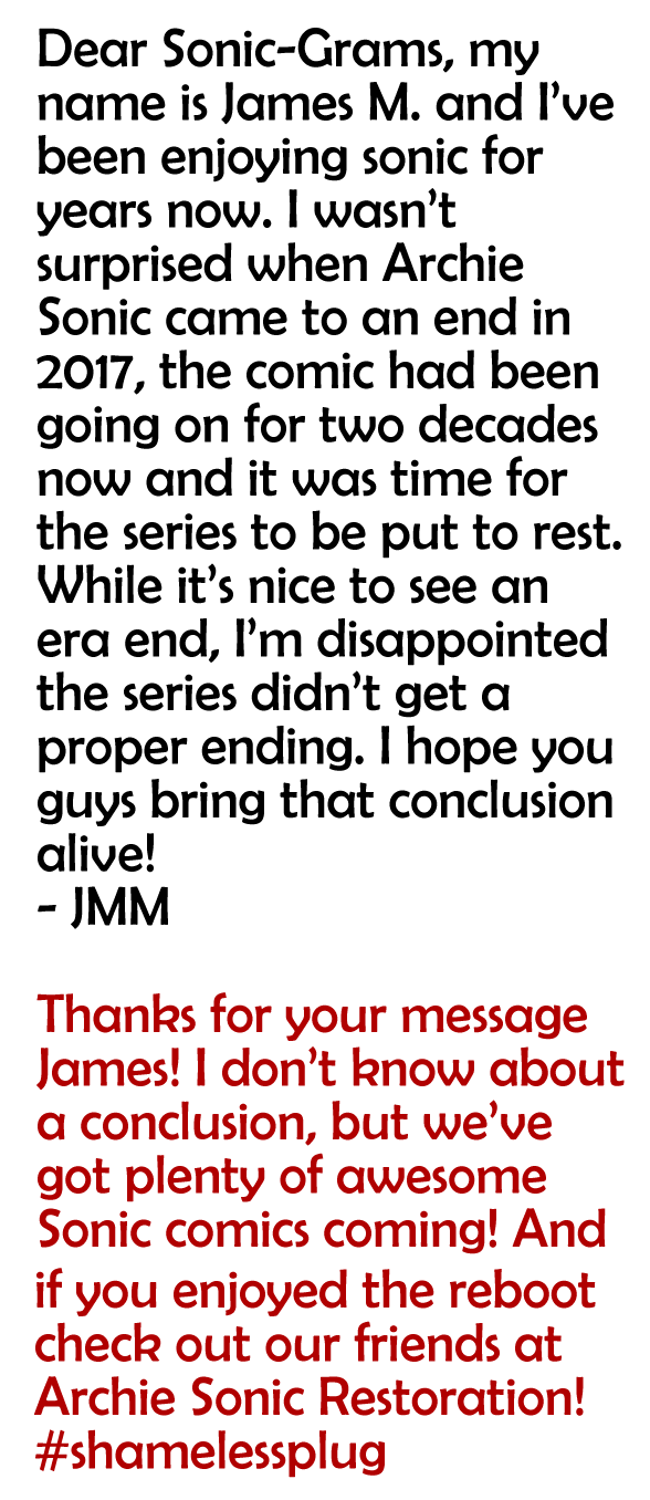 This entry in the Archie Sonic Online comics was incredible and worth the wait, I enjoyed reading it and this basically might be my favorite now. The long awaited proper conclusion of the Mecha Sally arc has now arrived and seeing what could have been for the official comic book was incredible. The art is amazing, the writers did a great job and I love the visuals and the stories too. I cannot wait for more Archie Sonic Online goodness coming very soon, including the Sonic Underground epilogue in the pages of Sonic Universe Online. Also, I finally got myself a Sonic Grams letter into the pages of Archie Sonic at long last after years of trying, woohoo!